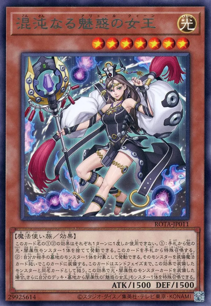 この効果で光・闇属性モンスターカードを装備した場合、さらに自分のデッキ・墓地から闇属性の「魅惑の女王」モンスター1体を特殊召喚できる。