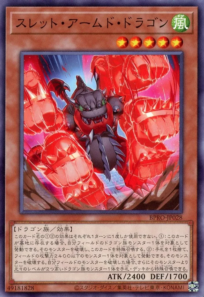 共通効果である特殊召喚と、風属性モンスターと共に手札から墓地に送ることでデッキからドラゴン族1体を埋葬できる効果を備えています。