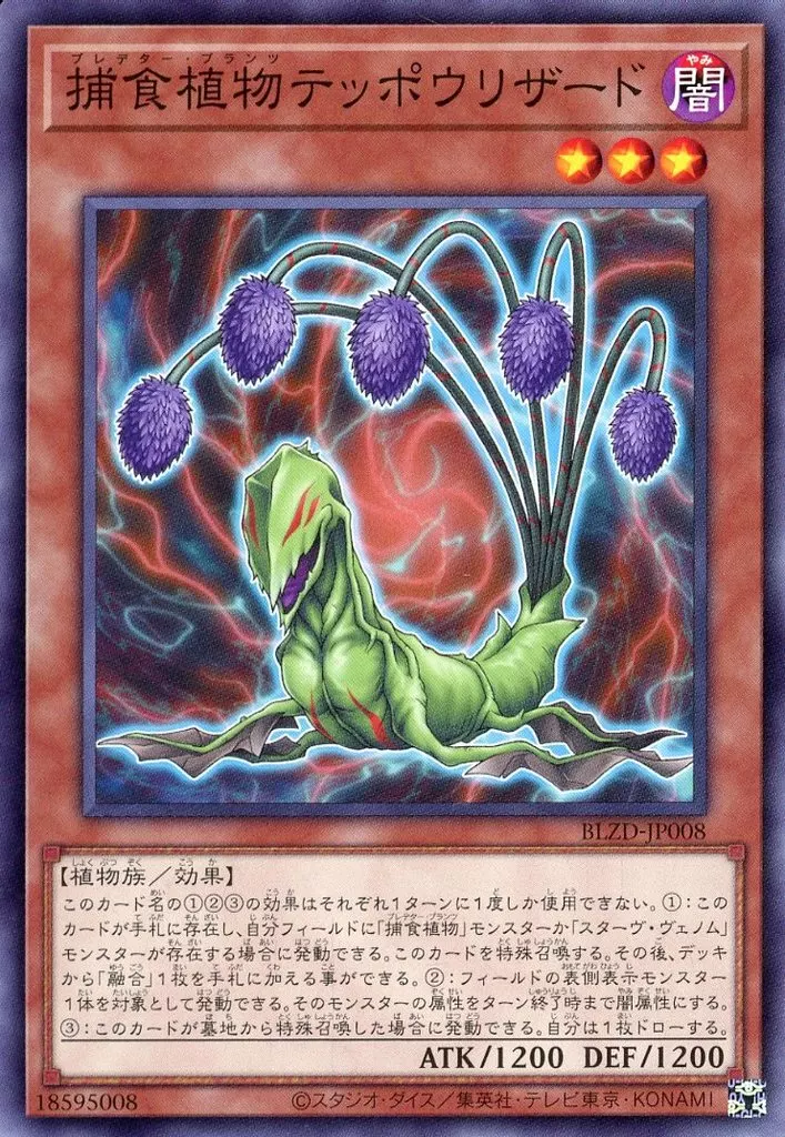(1):このカードが手札に存在し、自分フィールドに「捕食植物」モンスターか「スターヴ・ヴェノム」モンスターが存在する場合に発動できる。このカードを特殊召喚する。