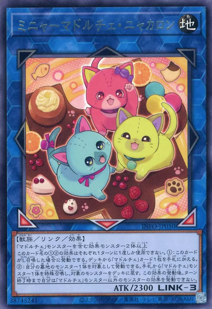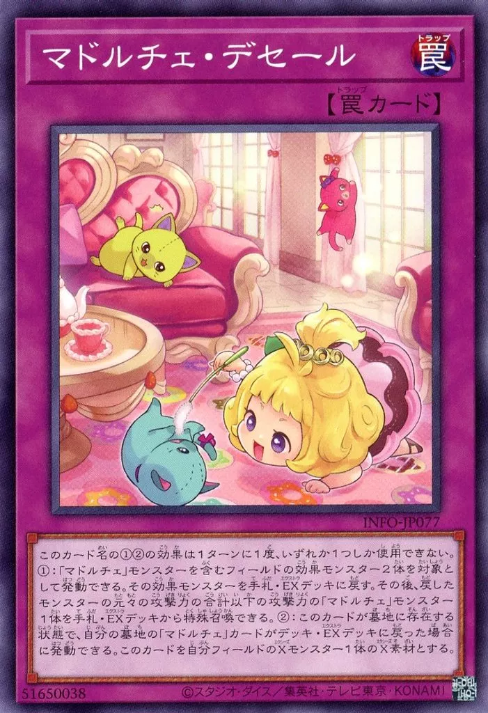 このカードが特殊召喚に成功した時、自分フィールド上に「マドルチェ」と名のついた獣族モンスターが存在する場合、デッキから「マドルチェ」と名のついた魔法・罠カード1枚を手札に加える事ができる。