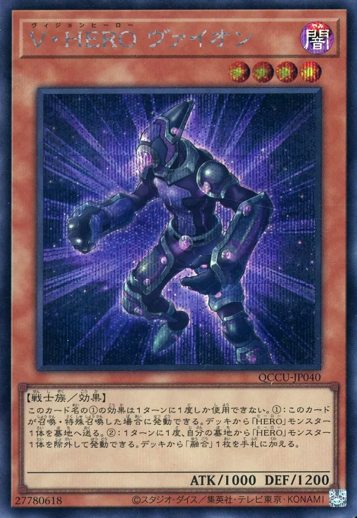 【カード検索】《V・HERO ヴァイオン》 初動 2025.04.082025.04.13V・HERO ヴァイオン星4/闇属性/戦士族/攻1000/守1200 このカード名の(1)の効果は1ターンに1度しか使用できない。 (1):このカードが召喚・特殊召喚した場合に発動できる。 デッキから「HERO」モンスター1体を墓地へ送る。 (2):1ターンに1度、自分の墓地から「HERO」モンスター1体を除外して発動できる。 デッキから「融合」1枚を手札に加える。
